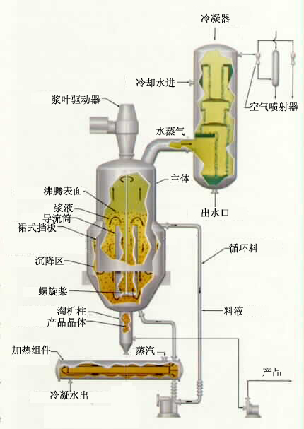 產品簡介:DTB型真空蒸發結晶器 DTB蒸發結晶器(導流筒結晶器)是一種高效率的結晶設備,由PLC控制物料溫度,其獨特的結構和工作原理決定了它具有傳熱效率高、配置簡單、操作控制方便、操作