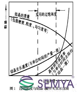 對結晶影響最主要的因素是溶液的過飽和度,如果溶液沒有過飽和度,晶核既不能生成,結晶也不能生長。過飽和度大一些對生產(chǎn)有利,因為推動力大,晶核的形成速率和結晶的生長速率都大,但也不是越大越好。如果料液過飽和度太大,晶核形成速率很快上升,使結晶生長速率降低,會出現(xiàn)產(chǎn)品粒度過細,影響產(chǎn)品質量。過飽和度與結晶、操作關系示意如圖1 所示