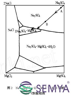 無水硫酸鈉生產(chǎn)所使用的原料中,除了主要的Na+ 、SO42 -離子外,一般都含有少量的Ca2 + 、Mg2 + 、和Cl -離子,生產(chǎn)時蒸發(fā)器內壓力、溫度等條件保持不變,隨著蒸發(fā)的進行,結晶的硫酸鈉不斷取出, 料液中Ca2 + 、Mg2 + 離子濃度相對增大, 體現(xiàn)在Na + 、Mg2 + // Cl -、SO42--H2O 相圖上,如開始在A 點,生產(chǎn)一段時間后體系移到B 點見圖2, 繼續(xù)生產(chǎn),體系逐漸由Na2SO4 的結晶區(qū)移到Na2SO4 與復鹽3Na2SO4 ·MgSO4 的共飽線上,此時無水鈉鎂礬開始析出,在操作溫度不變情況下,體系將沿此共飽線移動,產(chǎn)品質量開始下降。如果溫度升高時,Na2SO4 的結晶區(qū)逐漸縮小,而3Na2SO4 ·MgSO4 的結晶區(qū)逐漸增大, 體系落在了3Na2SO4 ·MgSO4的結晶區(qū),顯然此時已不是我們所需要的產(chǎn)品了見圖3 。由于無水鈉鎂礬的結晶顆細小,在粘度較大的硫酸鈉溶液中不易沉降,蒸發(fā)罐內就會呈現(xiàn)糊狀,使蒸發(fā)無法正常進行,結晶也不會再繼續(xù)長大,排出的料液經(jīng)離心機脫水非常困難,濕硝中母液含量較大,氣流干燥也無法正常運行,產(chǎn)品放置時間長了便結為大塊。為避免上述現(xiàn)象發(fā)生,除對硝液進行凈化外,應適當降低排料溫度,即降低蒸發(fā)終溫。從圖2 、圖3 中可以看出,Na2SO4的結晶區(qū)隨著溫度的降低而增大,這不僅提高了產(chǎn)品產(chǎn)量,而且極大的降低了雜鹽的析出量,大大提高了產(chǎn)品質量。那么是不是排料溫度越低越好呢? 也不是,圖4 是Na2SO4 -H2O 系統(tǒng)相圖,從圖中可以看出,硫酸鈉溶解度在32138 ℃最大,低于此溫度時,系統(tǒng)不再結晶Na2 SO4 , 而是結晶出Na2 SO4 ·10H2O 。當料液溫度接近32138 ℃時, 由于硫酸鈉溶解度增大,產(chǎn)量將受到影在水中響, 這對生產(chǎn)是不利的。